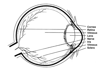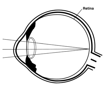 Chapter Two How the Eye Works I n order for you to fully understand how refractive surgery works, you need to understand how your eye works. This basic knowledge will help you determine if LASIK is right for you. The primary purpose of your eye is to focus light. When the rays of light are not focused properly, you need glasses or contact lenses. Your eye works very much like a camera. Light enters the eye through the cornea, the clear front surface or "window" of the eye. As the light passes through the cornea, it is bent or refracted. This bent light then travels through the pupil and into the lens. The lens acts to fine tune the focus of light onto the retina. The retina turns the light energy into electrical impulses that travel along the optic nerve from the eye to the brain, where the image is interpreted. On the following pages is a series of pictures and short descriptions of the various parts of the eye that will help you understand the vision process, why vision is sometimes blurry, and how these vision disorders can be corrected. ![]() Diagram of anatomy of the eye ![]() Normal eyesight is present when light rays strike the retina, causing a clear image to form Sclera The sclera is the support layer of the eye. It is the white part of the eye that you see in the mirror and provides structure and protection for the eye. Cornea The cornea is the front-most surface of the eye, like the crystal of a watch. It provides most of the eye's focusing power. Most of the refracting (bending) of light is achieved by the cornea, so small changes in the surface of the cornea can have a large effect on how your eye focuses light. Iris The iris is the colored part of the eye. The muscles of the iris act to control the size of the pupil. Pupil The pupil is the black spot in the center of the iris. The pupil acts to regulate the amount of light that enters the eye. In bright sunlight it becomes small to let in less light. In a dark environment the pupil expands to allow more light to reach the retina. Lens The lens is a normally clear structure located behind the pupil. It acts to fine tune the focusing. By changing shape, the lens allows us to focus near and far. This ability to focus near (accommodation) gradually worsens with age as the lens gets harder and less supple. Most people notice this in their early forties, at which time they begin to need reading glasses or bifocals. In people over sixty, the lens may become cloudy. This clouding of the lens is called a cataract and may interfere with your vision. Vitreous This is the clear gel substance that fills the space between the lens and the retina. If there are opacities in the vitreous, you will see them as "floaters." Retina The retina is the thin layer of tissue that lines the inside wall of the eye. It is very similar to film in a camera in that it functions to capture and transmit images for interpretation to the brain. Optic Nerve The optic nerve carries the images from the retina to the brain. Refractive Errors Refractive errors (visual problems) refer to disorders that are related to how your eye focuses light. The word refraction is used to describe the way light is bent by your eye. The factors that influence how your eye refracts (bends) rays of light are the curvature of your cornea, the power of your lens, and the length of your eye. ![]() In myopia (nearsightedness), rays of light focus in front of the retina instead of upon it, causing distant objects to appear blurred Myopia (nearsightedness) Myopia occurs when the curvature of the cornea is too steep for the length of the eye or the eye is functionally too long. As the light rays pass through the steep cornea, they are bent too sharply and come to a point of focus in front of the retina. This creates a blurred image. Patients with myopia are able to see near objects well but have difficulty with their distance vision. Hyperopia (farsightedness) Hyperopia occurs when the eye is functionally too short or the curvature of the cornea is effectively too flat. The light rays that enter the eye are not bent sharply enough, causing them to come to a point of focus behind the retina. This produces a blurred image. Farsightedness means distant objects are seen more clearly than near objects. Although farsighted patients see distant objects more clearly than near objects, they often have difficulty with both, especially as they get older. ![]() In hyperopia (farsightedness), rays of light focus behind the retina. Some younger people who are mildly farsighted are able to use the focusing muscle around their lens (accommodation) to bend the light more steeply. This brings the point of focus forward toward the retina and allows them to see more clearly. However, this ability decreases with age, so that reading glasses are needed at an earlier age than normal, and bifocals may also be needed to see at a distance. Farsightedness is often confused with presbyopia. Presbyopia is the age-dependent need for reading glasses. Even people who never wore glasses before find that they start needing reading glasses in their forties and fifties. This is because the up-close focusing ability of the natural lens is progressively lost with age. This occurs with everybody. At first they just need them for seeing things up close (presbyopia). Farsighted people, in whom the cornea is truly too flat for the length of the eye, require the natural lens to supply the additional focus for both near and distance vision. Therefore, many farsighted individuals as they age not only lose their near vision, they lose their far vision as well and become totally dependent on their glasses or contact lenses. This phenomenon is called latent hyperopia. Astigmatism Many patients with myopia or hyperopia have some degree of astigmatism. This means that your cornea, rather than being completely spherical like a basketball, is slightly oval and shaped more like half a football. People with astigmatism experience blurred vis