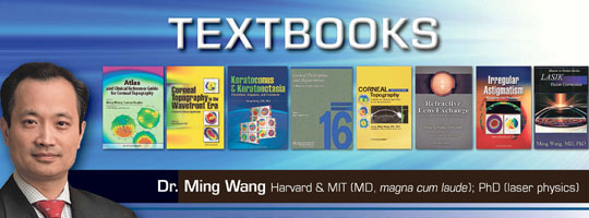 Dr. Wang's textbook on keratoconus, keratoectasia, genetics, family history, corneal topography, wavefront, LASIK complications, PRK complications, RK complications, vision, night glare, double vision, premium IOL complications after cataract surgery, LASIK surgeon, Nashville, Tennessee (TN).